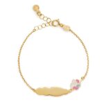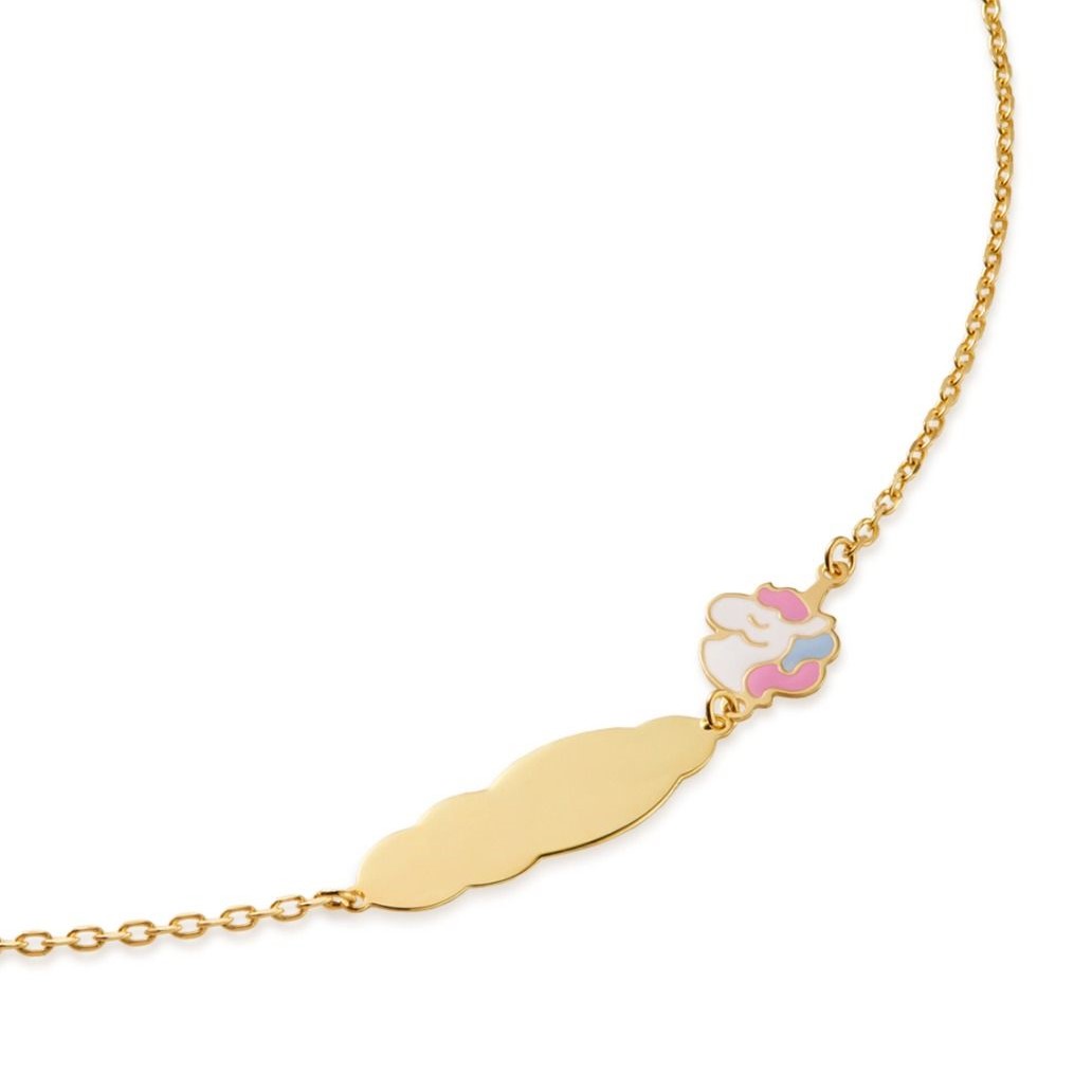 Bracciale Le Bebé in oro giallo 9Kt con targhetta e unicorno smaltato.