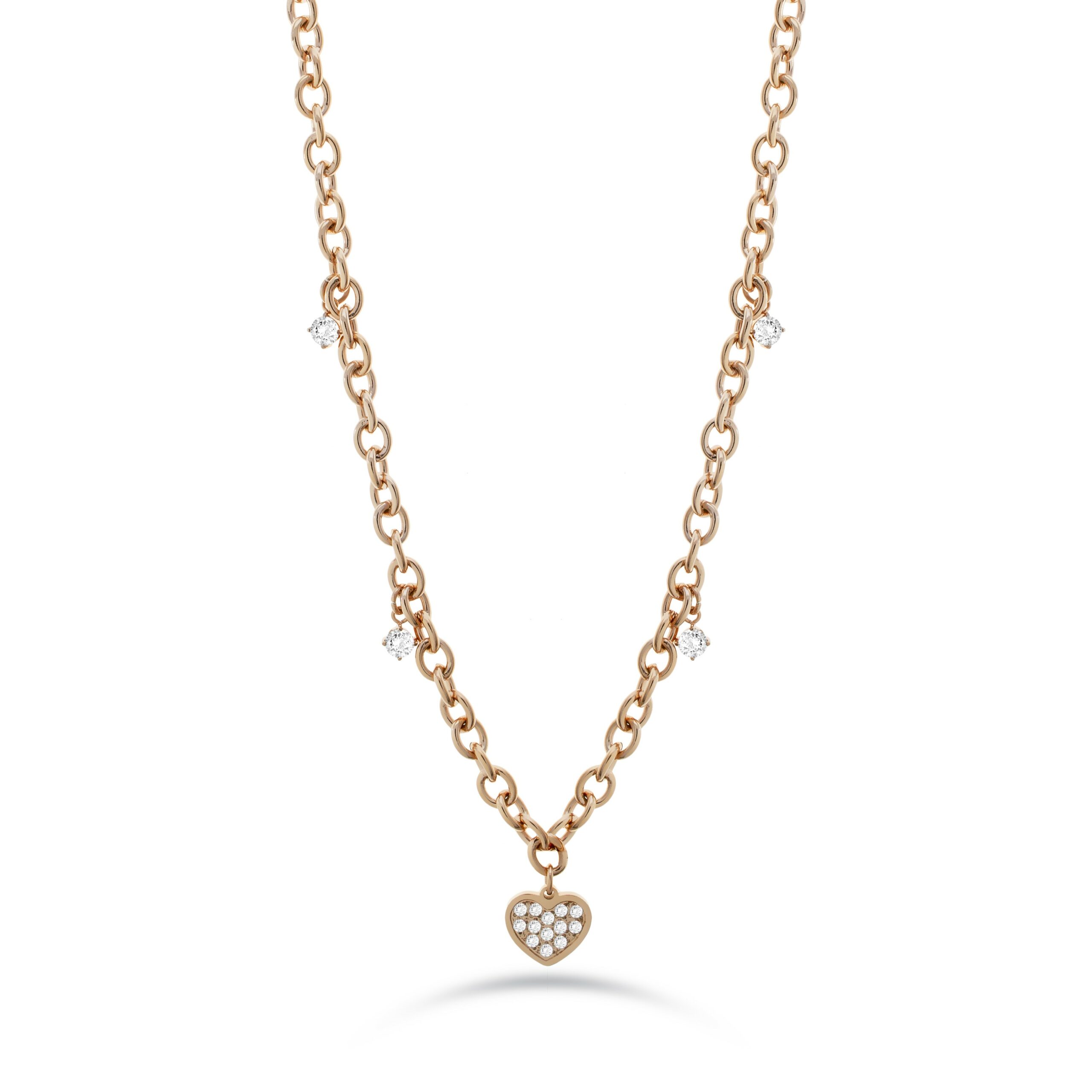 Collana Liu Jo collezione Essential in acciaio inossidabile colore oro rosa con zirconi bianchi e cuore pendente con zirconi.